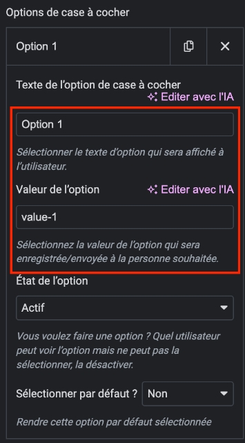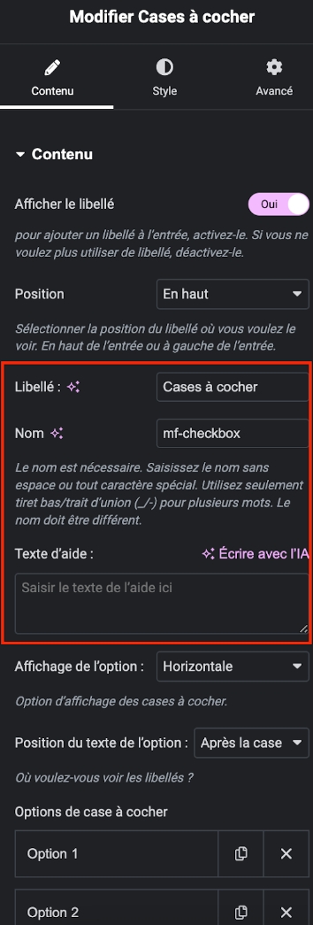 Accédez à l'onglet "Contenu" pour personnaliser le champ en modifiant le libellé, le nom, le texte d'aide (facultatif) et le texte de l’option de case à cocher.