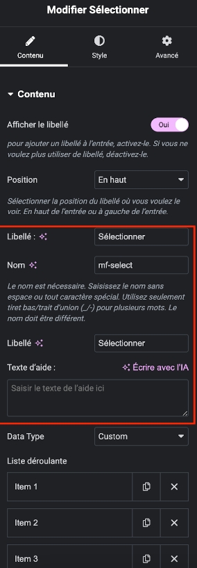 Personnalisez-le dans l'onglet "Contenu" en ajoutant les options de la liste.