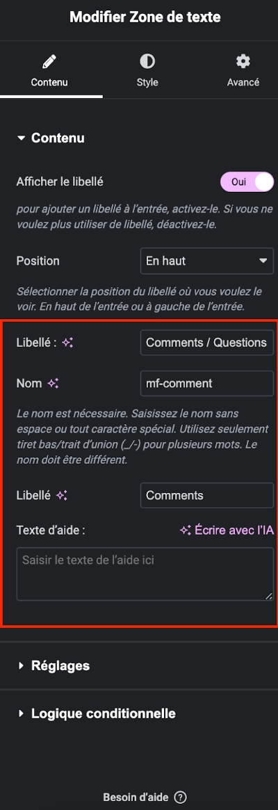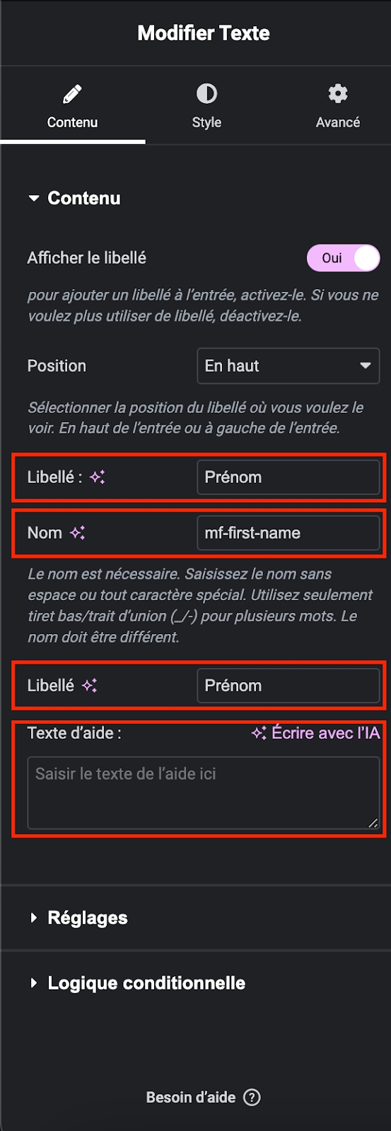 Utilisez le widget "Texte" et personnalisez-le en accédant à l'onglet "Contenu". Vous pouvez modifier le libellé, le nom et ajouter un texte d'aide.