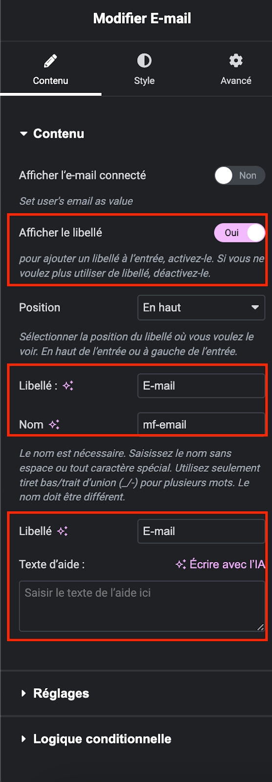 Procédez de la même manière que pour le champ Texte en utilisant le widget "E-mail".