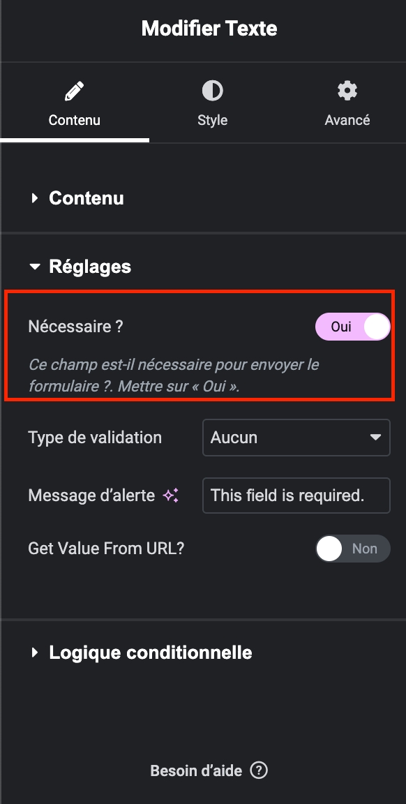 Pour rendre ce champ obligatoire, activez simplement l'option "Nécessaire" dans les réglages.