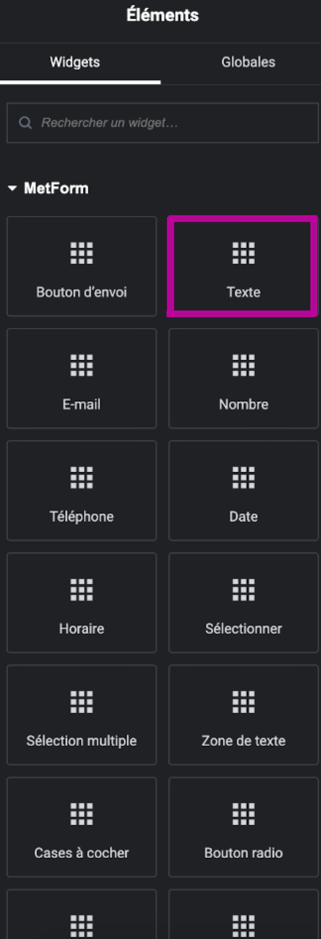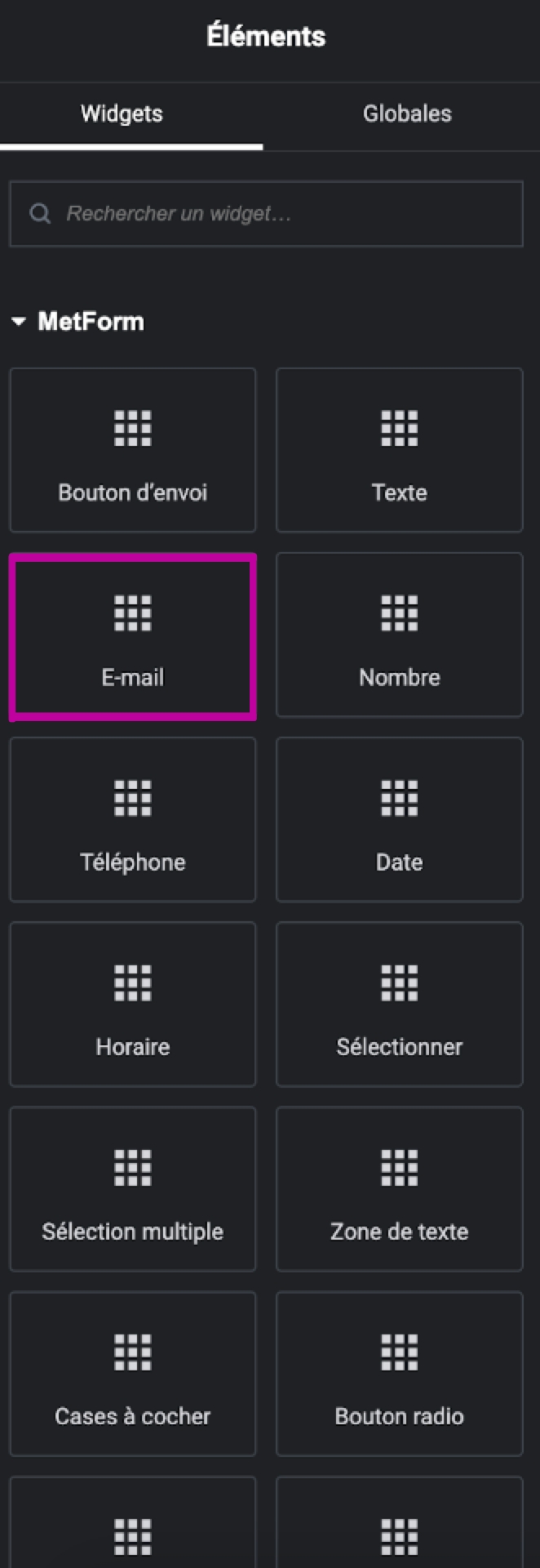 Parmi les widgets disponibles, choisissez celui qui correspond le mieux à vos besoins et faites-le glisser dans l'éditeur.